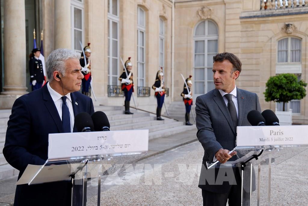 Phát biểu tại cuộc hội đàm ngày 5/7/2022 tại Paris, Tổng thống Pháp Emmanuel Macron bày tỏ tin tưởng Thủ tướng tạm quyền Israel Yair Lapid có khả năng kiến tạo nền hòa bình lịch sử với người Palestine, đồng thời kêu gọi Israel quay trở lại đối thoại chính trị với người Palestine. Trong ảnh: Tổng thống Pháp Emmanuel Macron (phải) và Thủ tướng Israel Yaïr Lapid tại cuộc họp báo sau hội đàm ở Paris, ngày 5/7/2022. Ảnh: AFP/TTXVN