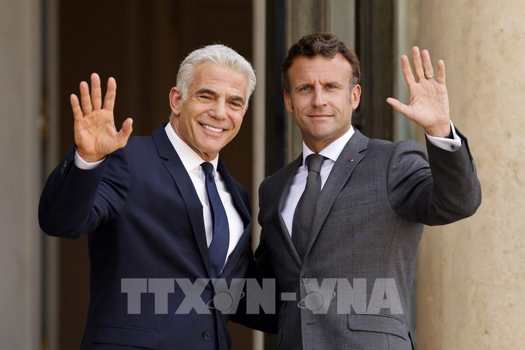 Phát biểu tại cuộc hội đàm ngày 5/7/2022 tại Paris, Tổng thống Pháp Emmanuel Macron bày tỏ tin tưởng Thủ tướng tạm quyền Israel Yair Lapid có khả năng kiến tạo nền hòa bình lịch sử với người Palestine, đồng thời kêu gọi Israel quay trở lại đối thoại chính trị với người Palestine. Trong ảnh: Tổng thống Pháp Emmanuel Macron (phải) và Thủ tướng Israel Yaïr Lapid tại cuộc gặp ở Paris, ngày 5/7/2022. Ảnh: AFP/TTXVN