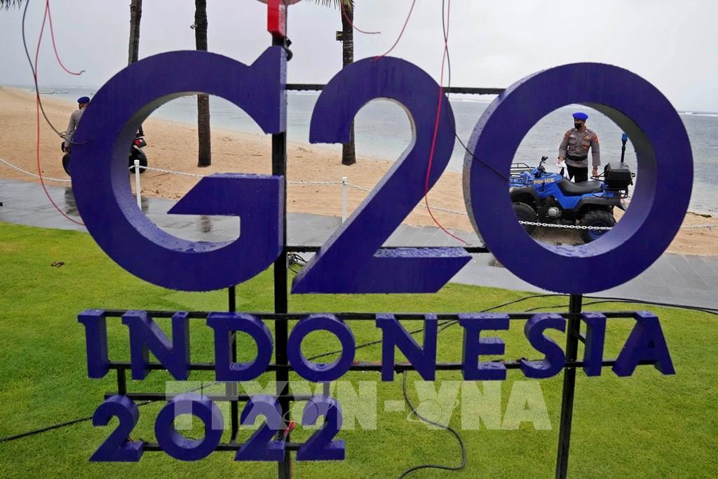 Hội nghị Ngoại trưởng Nhóm các nền kinh tế phát triển và mới nổi hàng đầu thế giới (G20) diễn ra ngày 7 - 8/7/2022 tại đảo Bali của Indonesia với chủ đề “Cùng nhau xây dựng một thế giới hòa bình, ổn định và thịnh vượng hơn”. Trong ảnh: Biểu tượng Hội nghị Ngoại trưởng G20 tại Nusa Dua, Indonesia, ngày 7/7/2022. Ảnh: AFP/ TTXVN