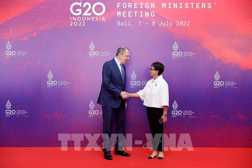 Hội nghị Ngoại trưởng Nhóm các nền kinh tế phát triển và mới nổi hàng đầu thế giới (G20) diễn ra ngày 7 - 8/7/2022 tại đảo Bali của Indonesia với chủ đề “Cùng nhau xây dựng một thế giới hòa bình, ổn định và thịnh vượng hơn”. Trong ảnh: Ngoại trưởng Indonesia Retno Marsudi (phải) đón Ngoại trưởng Nga Sergei Lavrov tới dự Hội nghị Ngoại trưởng G20 ở Bali, ngày 8/7/2022. Ảnh: AFP/ TTXVN