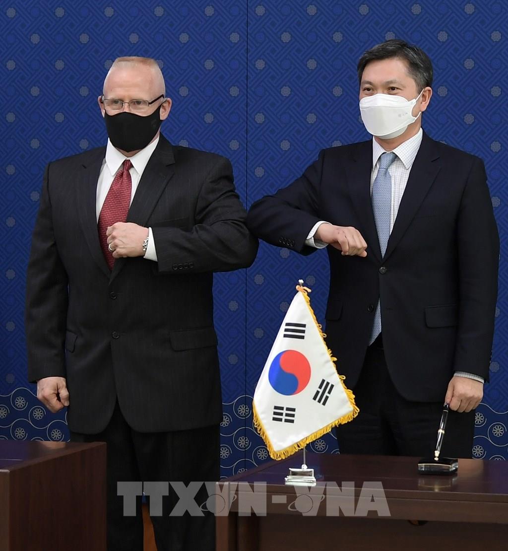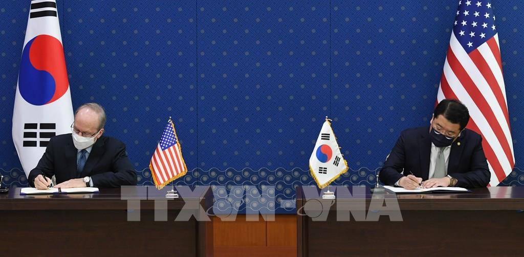 Hàn Quốc và Mỹ ngày 8/4/2021 đã chính thức ký thỏa thuận chia sẻ chi phí quốc phòng. Thứ trưởng Ngoại giao Hàn Quốc Choi Jong-kun (phải) và Đại biện lâm thời Đại sứ quán Mỹ ở Seoul Rob Rapson (trái) ký thỏa thuận, được gọi là Thỏa thuận các biện pháp đặc biệt (SMA), có hiệu lực đến năm 2025. Theo đó, Seoul sẽ chi trả 1.183.000 tỷ won (1,05 tỷ USD) trong năm nay, tăng so với con số 1.038.000 tỷ won năm 2019, để duy trì lực lượng Mỹ gồm 28.500 binh sĩ ở Hàn Quốc. Ảnh: Yonhap/ TTXVN