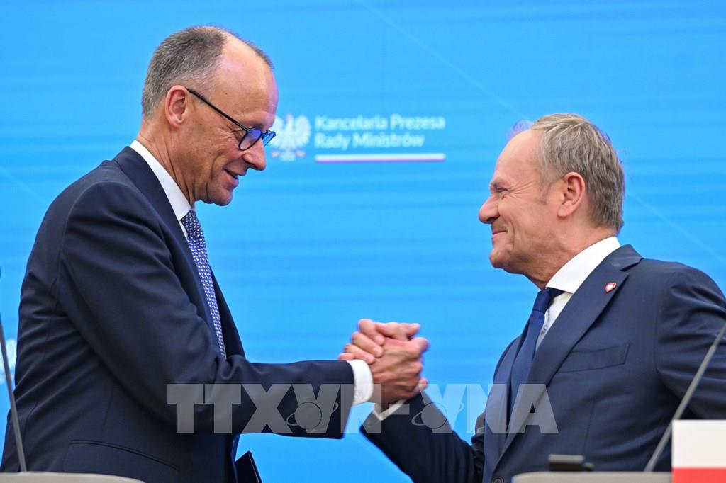 Ngày 7/5/2025, Thủ tướng Đức Friedrich Merz đã tới thủ đô Vácsava của Ba Lan, thể hiện quyết tâm tái khẳng định vai trò lãnh đạo của Berlin tại châu Âu. Ảnh: Thủ tướng Đức Friedrich Merz (trái) trong cuộc gặp Thủ tướng Ba Lan Donald Tusk tại Vácsava. Ảnh: PAP/TTXVN