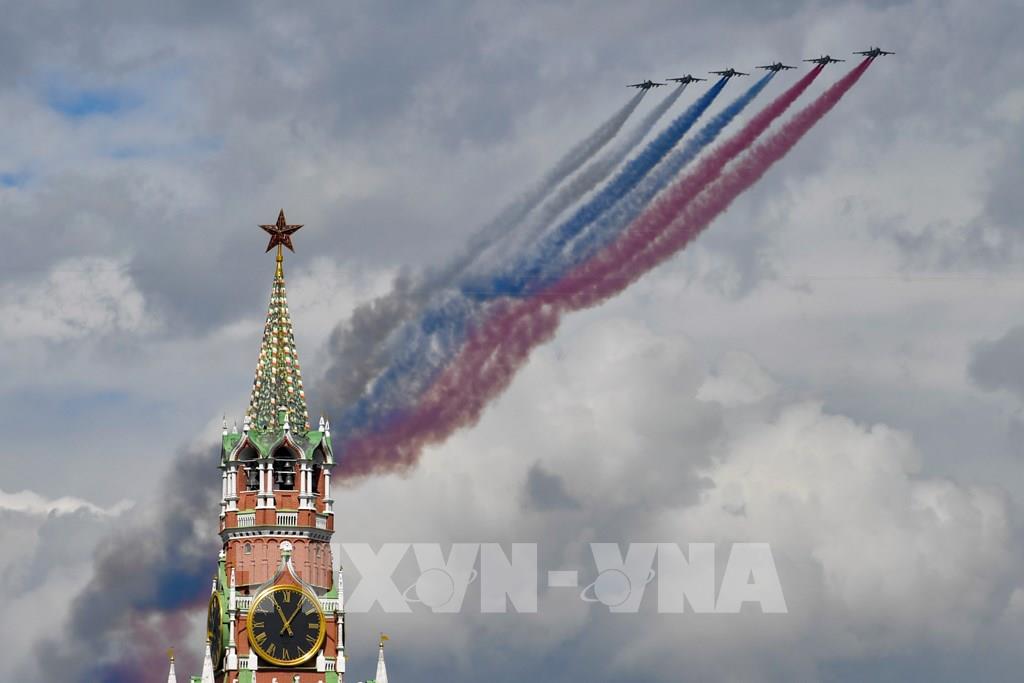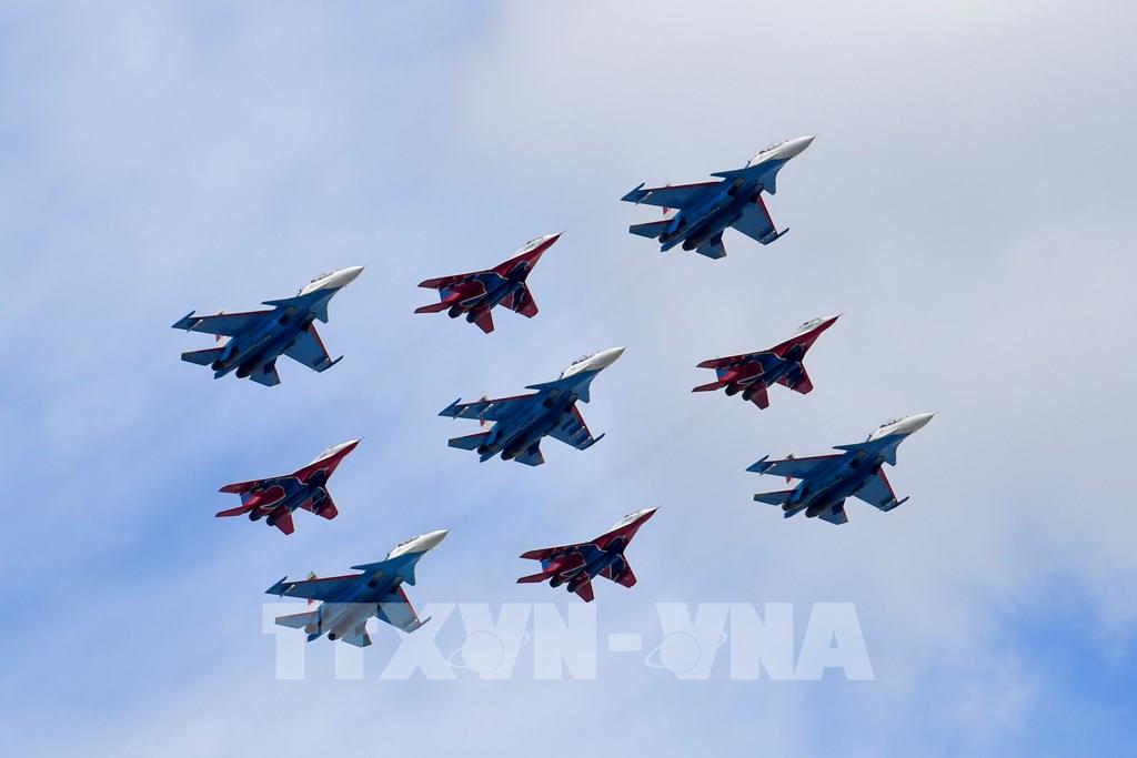 Ngày 9/5/2025, lễ duyệt binh kỷ niệm 80 năm Ngày Chiến thắng trong Chiến tranh Vệ quốc vĩ đại (9/5/1945 - 9/5/2025) diễn ra trọng thể tại thủ đô Moskva của Nga. Ảnh: Các máy bay trình diễn trong lễ tổng duyệt tại Moskva ngày 7/5/2025. Ảnh: THX/TTXVN
