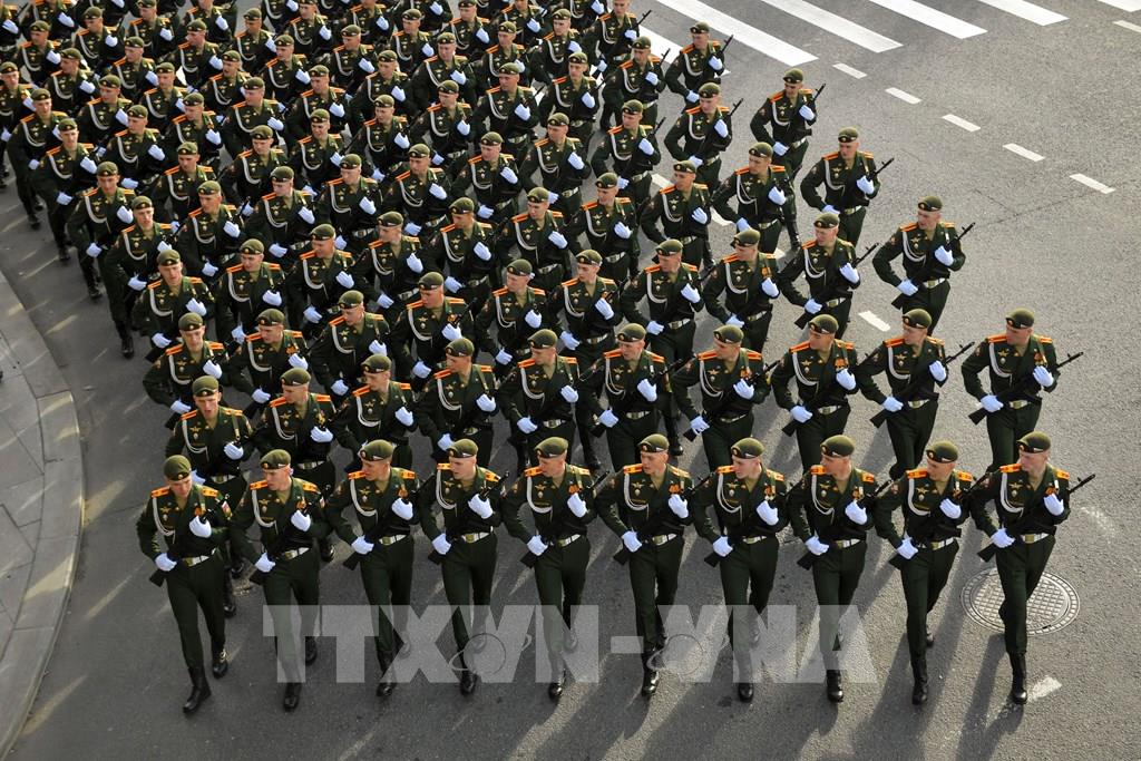 Ngày 9/5/2025, lễ duyệt binh kỷ niệm 80 năm Ngày Chiến thắng trong Chiến tranh Vệ quốc vĩ đại (9/5/1945 - 9/5/2025) diễn ra trọng thể tại thủ đô Moskva của Nga. Ảnh: Các binh sĩ tham gia lễ tổng duyệt tại Moskva ngày 7/5/2025. Ảnh: THX/TTXVN