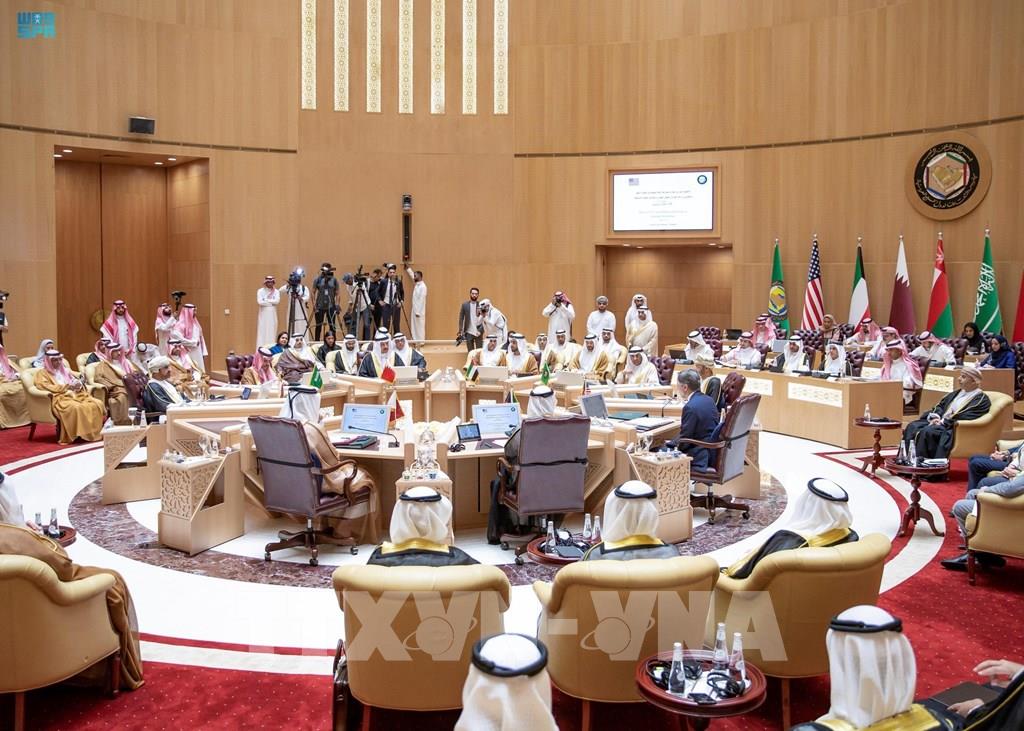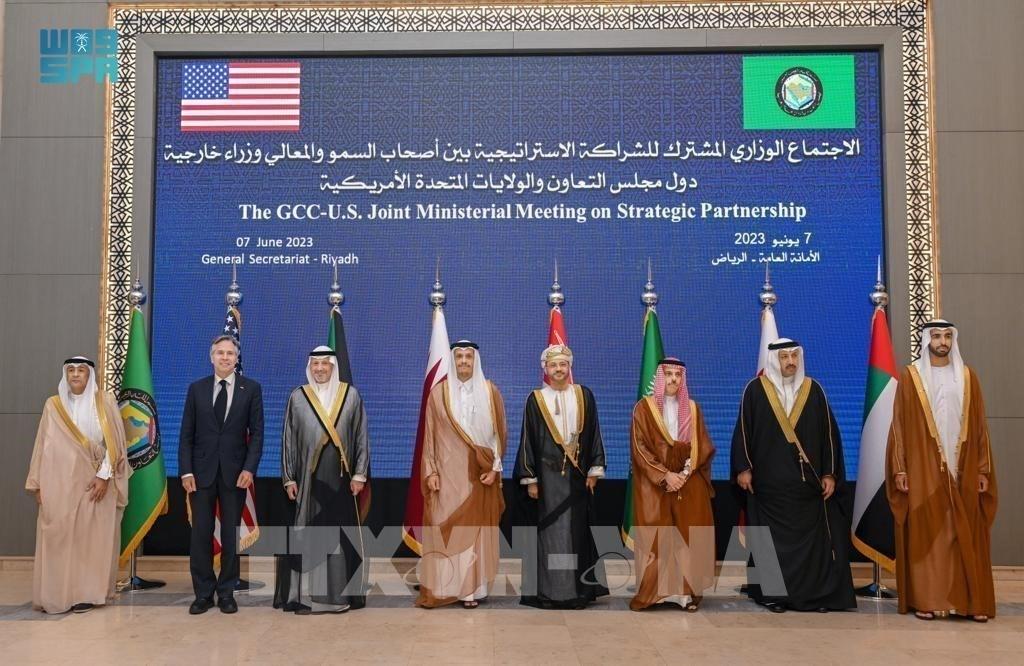 Sau cuộc họp ngày 8/6/2023 tại thành phố Riyadh của Saudi Arabia, Ngoại trưởng Mỹ Antony Blinken và những người đồng cấp các nước thành viên Hội đồng Hợp tác vùng Vịnh (GCC) đã ra tuyên bố chung về việc đạt được sự ổn định chính trị và kinh tế khu vực Trung Đông. Tuyên bố nhấn mạnh tầm quan trọng và triển vọng hứa hẹn của các dự án cơ sở hạ tầng nhằm thúc đẩy hội nhập và kết nối khu vực, góp phần vào sự ổn định và thịnh vượng của Trung Đông. Ngoại trưởng các nước GCC và Mỹ tái khẳng định tầm quan trọng của việc chống lại chủ nghĩa khủng bố và chủ nghĩa cực đoan bạo lực khu vực cũng như trên toàn thế giới. Ảnh: SPA/TTXVN