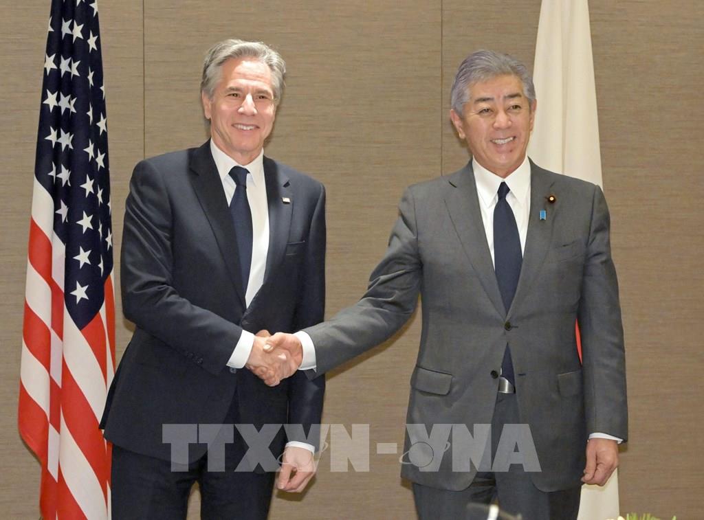 Tại cuộc hội đàm ngày 7/1/2025 ở Tokyo, Ngoại trưởng Nhật Bản Takeshi Iwaya (phải) và người đồng cấp Mỹ Antony Blinken đã tái khẳng định tầm quan trọng của hợp tác song phương Mỹ - Nhật cũng như ba bên với Hàn Quốc. Ảnh: Kyodo/TTXVN