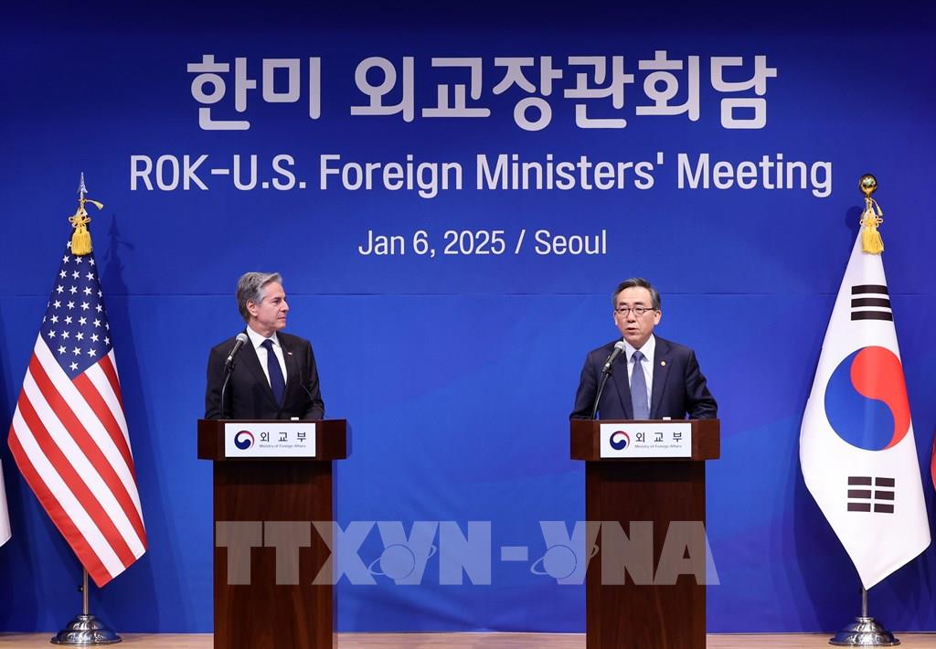 Ngày 6/1/2025, trong cuộc hội đàm với Ngoại trưởng Hàn Quốc Cho Tae-yul (phải) ở thủ đô Seoul, Ngoại trưởng Mỹ Antony Blinken (trái) đã nhấn mạnh nỗ lực của Tổng thống Joe Biden trong việc duy trì, củng cố liên minh ba bên Mỹ-Nhật-Hàn. Ảnh: THX/TTXVN