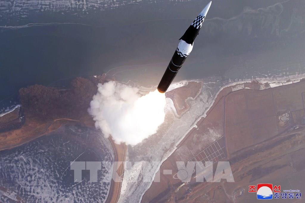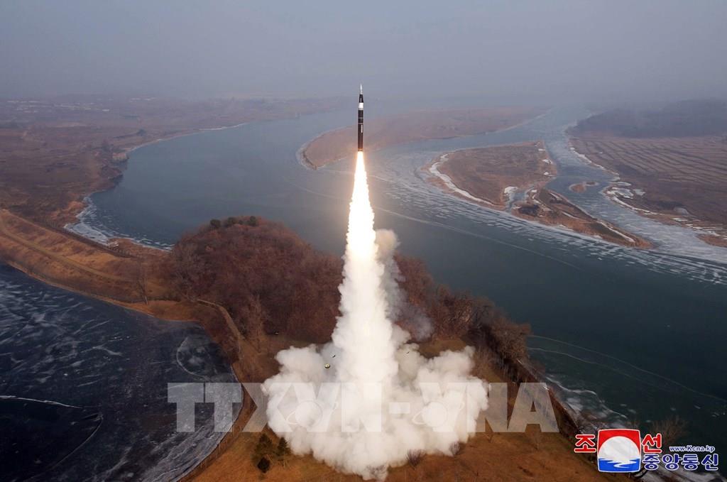 Ngày 7/1/2025, Hãng thông tấn trung ương Triều Tiên (KCNA) đưa tin nước này đã tiến hành thử nghiệm thành công một loại tên lửa tầm trung siêu thanh mới trước đó một ngày. Sau khi được phóng từ một bãi phóng ở vùng ngoại ô thủ đô Bình Nhưỡng về phía Đông Bắc, tên lửa đã đạt đến độ cao 99,8 km, sau đó là 42,5 km trong khi bay qua quãng đường 1.500 km với tốc độ gấp 12 lần tốc độ âm thanh. Cuối cùng, tên lửa đã đáp xuống xuống vùng biển mục tiêu. Ảnh: KCNA/TTXVN