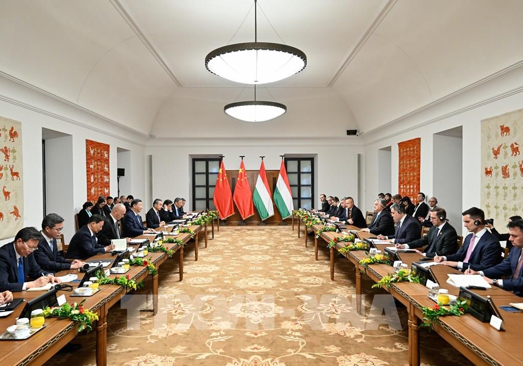 Từ ngày 5-10/5/2024, Chủ tịch Trung Quốc Tập Cận Bình công du châu Âu với các chặng dừng chân ở Pháp, Serbia và Hungary. Đây là chuyến thăm đầu tiên của một nguyên thủ quốc gia Trung Quốc tới Liên minh châu Âu (EU) trong gần 5 năm qua, được đánh giá có ý nghĩa quan trọng trong việc thúc đẩy tổng thể mối quan hệ giữa Trung Quốc với 3 nước nói riêng cũng như với EU nói chung phát triển ổn định và lành mạnh, góp phần củng cố sự ổn định trong một thế giới đầy biến động. Trong ảnh: Thủ tướng Hungary Viktor Orban và Chủ tịch Trung Quốc Tập Cận Bình tại cuộc hội đàm ở Budapest, Hungary, ngày 9/5/2024. Ảnh: THX/TTXVN