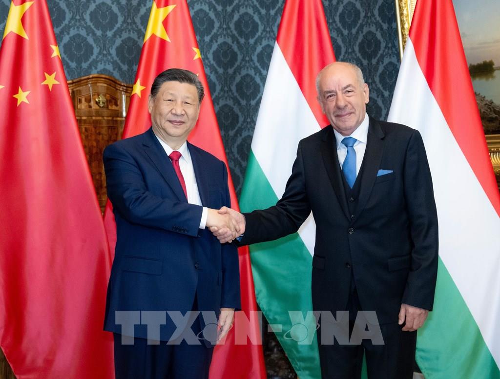 Từ ngày 5-10/5/2024, Chủ tịch Trung Quốc Tập Cận Bình công du châu Âu với các chặng dừng chân ở Pháp, Serbia và Hungary. Đây là chuyến thăm đầu tiên của một nguyên thủ quốc gia Trung Quốc tới Liên minh châu Âu (EU) trong gần 5 năm qua, được đánh giá có ý nghĩa quan trọng trong việc thúc đẩy tổng thể mối quan hệ giữa Trung Quốc với 3 nước nói riêng cũng như với EU nói chung phát triển ổn định và lành mạnh, góp phần củng cố sự ổn định trong một thế giới đầy biến động. Trong ảnh: Tổng thống Hungary Tamas Sulyok và Chủ tịch Trung Quốc Tập Cận Bình tại cuộc gặp ở Budapest, Hungary, ngày 9/5/2024. Ảnh: THX/TTXVN