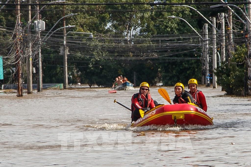 Ngày 8/5/2024, giới chức Brazil cho biết ít nhất 107 người đã thiệt mạng, 130 người mất tích và gần 100.000 ngôi nhà bị phá hủy hoặc hư hại nặng nề sau hơn một tuần mưa lũ kỷ lục ở bang Rio Grande do Sul, miền Nam nước này. Theo thông tin cập nhật từ Liên đoàn các đô thị quốc gia, nước sông tràn bờ và lũ lụt ở bang Rio Grande do Sul đã ảnh hưởng đến khoảng 1,45 triệu người và buộc khoảng 200.000 người phải rời bỏ nhà cửa. Ảnh: THX/TTXVN