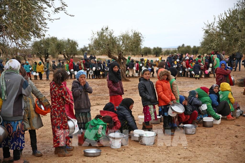 Theo báo cáo của Tổ chức Nông Lương của Liên hợp quốc (FAO) và Chương trình Lương thực thế giới (WFP), tình trạng mất an ninh lương thực nghiêm trọng có thể sẽ còn tồi tệ hơn nữa ở 20 quốc gia trong khoảng thời gian từ tháng 6 đến tháng 9/2022. Trong ảnh: Người dân xếp hàng chờ được phát lương thực cứu trợ tại trại tị nạn ở Yazi Bagh, Aleppo, Syria. Ảnh: AFP/ TTXVN