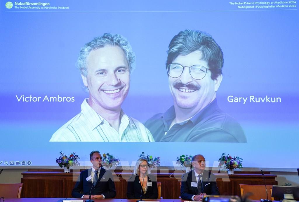 Mùa Nobel 2024 bắt đầu, vinh danh thành quả sáng tạo và phát minh mang tính đột phá của các nhà khoa học. Chiều 7/10/2024, tại thủ đô Stockholm (Thụy Điển), Hội đồng Nobel đã công bố giải Nobel Y Sinh 2024 thuộc về 2 nhà khoa học người Mỹ là Victor Ambros và Gary Ruvkun với việc phát hiện ra RNA siêu nhỏ (microRNA hay microARN), qua đó khám phá ra nguyên lý cơ bản chi phối cách thức điều hòa hoạt động của gene. Ảnh: THX/TTXVN