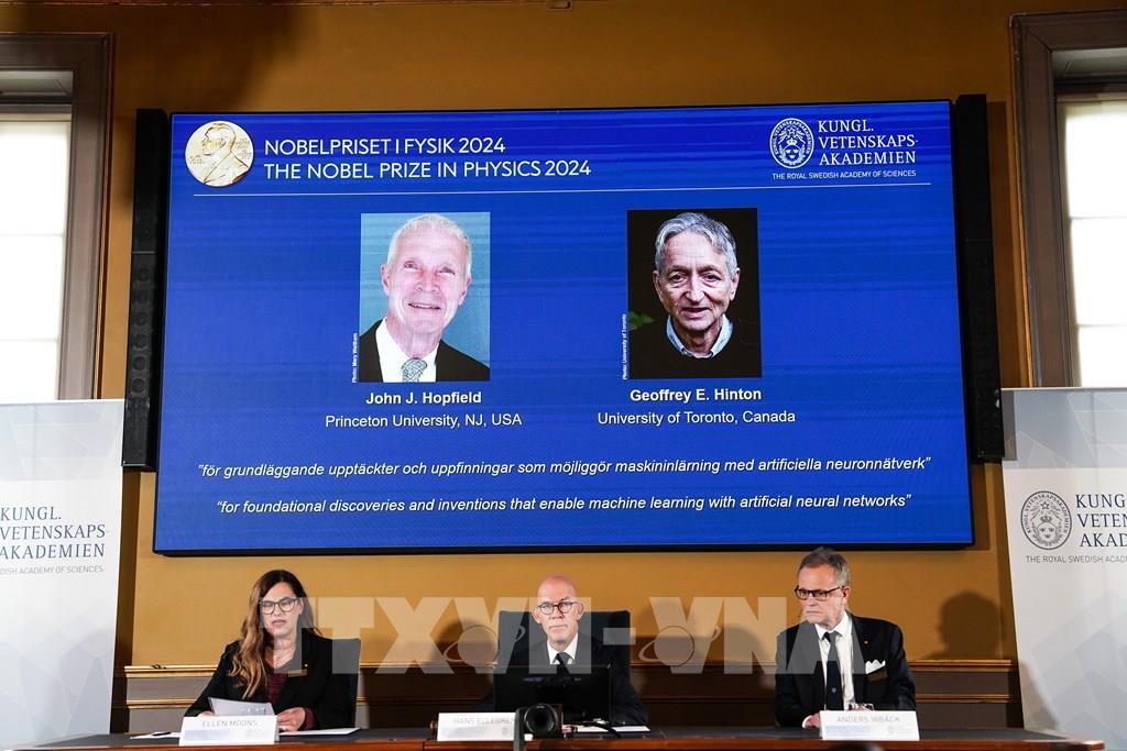 Mùa Nobel 2024 bắt đầu, vinh danh thành quả sáng tạo và phát minh mang tính đột phá của các nhà khoa học. Chiều 8/10/2024, hai nhà khoa học John Joseph Hopfield - người Mỹ và Geoffrey Everest Hinton - người Canada gốc Anh đã trở thành chủ nhân Giải Nobel Vật lý 2024 nhờ những khám phá và phát minh cơ bản cho phép học máy sử dụng mạng lưới thần kinh nhân tạo, theo đó cách mạng hóa khoa học, kỹ thuật và cuộc sống hằng ngày. Ảnh: THX/TTXVN