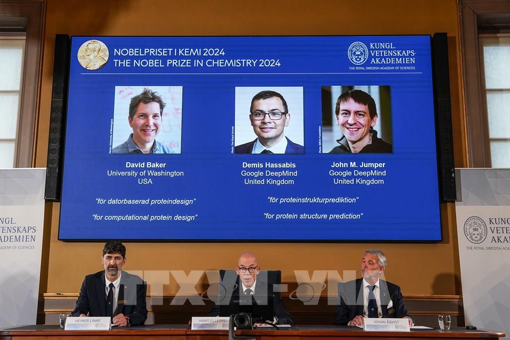 Mùa Nobel 2024 bắt đầu, vinh danh thành quả sáng tạo và phát minh mang tính đột phá của các nhà khoa học. Ngày 9/10/2024, tại thủ đô Stockholm, Hội đồng Nobel của Viện Hàn lâm Khoa học Hoàng gia Thụy Điển công bố Giải Nobel Hóa học năm 2024 thuộc về 2 công trình có tiềm năng lớn, sử dụng trí tuệ nhân tạo (AI) để "giải mã" về protein. Các tác giả gồm Giáo sư David Baker thuộc Đại học Washington, Mỹ với công trình thiết kế các loại protein hoàn toàn mới dựa trên phương pháp tính toán, và hai nhà khoa học John M. Jumper (người Mỹ), Demis Hassabis (người Anh) đến từ công ty Google DeepMind với mô hình dự đoán cấu trúc protein. Ảnh: THX/TTXVN