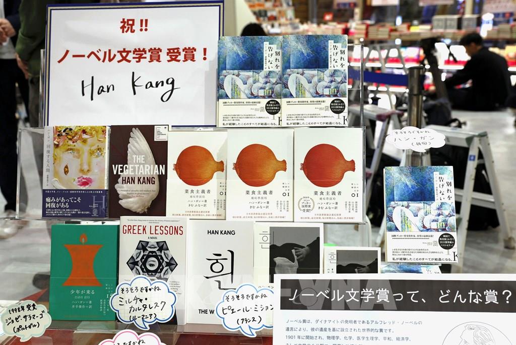 Mùa Nobel 2024 bắt đầu, vinh danh thành quả sáng tạo và phát minh mang tính đột phá của các nhà khoa học. Ngày 10/10/2024, Viện Hàn lâm Thụy Điển đã công bố Giải Nobel Văn học năm 2024 thuộc về nữ nhà văn người Hàn Quốc Han Kang, sinh năm 1970, vì những tác phẩm "văn xuôi đầy chất thơ mãnh liệt khi đối mặt với những tổn thương trong quá khứ và phơi bày sự mong manh của cuộc sống con người”. Ảnh: Các tác phẩm của Han Kang. Kyodo/TTXVN