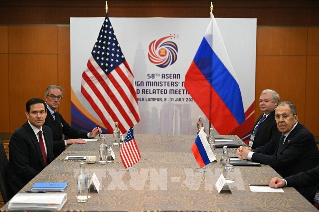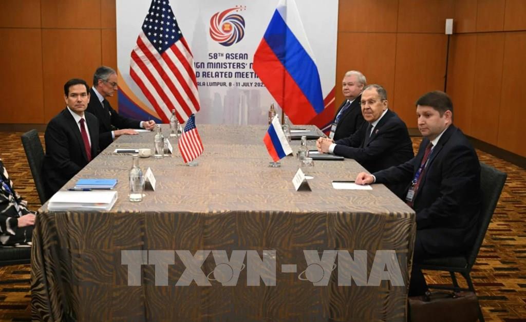 Ngoại trưởng Nga Sergey Lavrov (phải) và người đồng cấp Mỹ Marco Rubio (trái) đã có cuộc hội đàm bên lề Diễn đàn Khu vực ASEAN ngày 10/7, trong bối cảnh giao tranh tại Ukraine leo thang và Mỹ bắt đầu nối lại viện trợ vũ khí cho Kiev. Hai nhà lãnh đạo đã đề cập đến một “ý tưởng mới” do phía Nga đưa ra liên quan đến xung đột tại Ukraine. Moskva tái khẳng định sẵn sàng tìm kiếm giải pháp hòa bình, đồng thời bày tỏ mong muốn khôi phục hợp tác kinh tế - nhân đạo và nối lại giao thông hàng không trực tiếp giữa hai nước. Ảnh: aljazeera.com/TTXVN