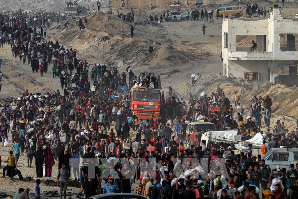 Người dân Palestine nhận hàng cứu trợ tại phía Bắc Dải Gaza, ngày 22/6/2025. Ảnh: THX/TTXVN