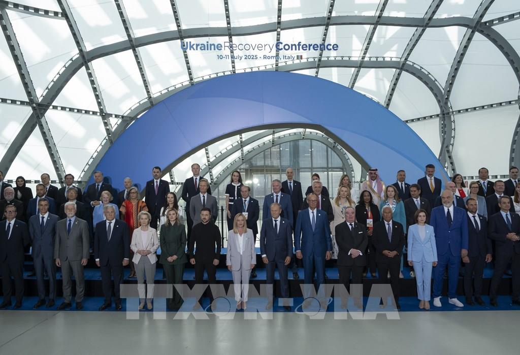 Ngày 10/7, hội nghị quốc tế tại Rome (Italy) về tái thiết kinh tế Ukraine (ảnh) đã cam kết hỗ trợ hơn 10 tỷ euro (11,7 tỷ USD) cho Ukraine, trong đó Ủy ban châu Âu (EC) cam kết 2,3 tỷ euro. Hội nghị diễn ra trong bối cảnh xung đột tại Ukraine tiếp diễn. Số tiền quyên góp được sẽ dùng đầu tư để xây dựng lại nhà cửa, mở cửa lại bệnh viện, phục hồi doanh nghiệp và đảm bảo năng lượng. Ảnh: AA/TTXVN