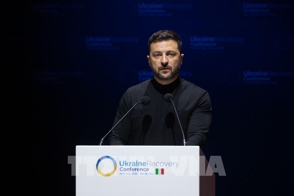 Ngày 10/7, hội nghị quốc tế tại Rome (Italy) về tái thiết kinh tế Ukraine (ảnh) đã cam kết hỗ trợ hơn 10 tỷ euro (11,7 tỷ USD) cho Ukraine, trong đó Ủy ban châu Âu (EC) cam kết 2,3 tỷ euro. Hội nghị diễn ra trong bối cảnh xung đột tại Ukraine tiếp diễn. Số tiền quyên góp được sẽ dùng đầu tư để xây dựng lại nhà cửa, mở cửa lại bệnh viện, phục hồi doanh nghiệp và đảm bảo năng lượng. Ảnh: Tổng thống Ukraine Volodymyr Zelensky phát biểu tại Hội nghị. Ảnh: AA/TTXVN