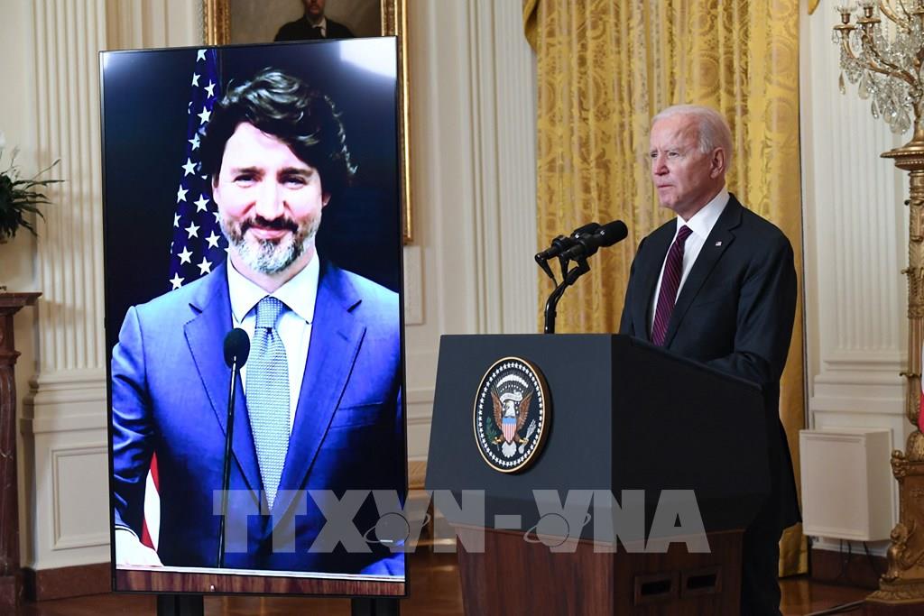 Tại cuộc hội đàm song phương trực tuyến đầu tiên giữa Thủ tướng Canada Justin Trudeau (ảnh màn hình) và Tổng thống Mỹ Joe Biden ngày 23/2/2021, hai nhà lãnh đạo đã củng cố “quan hệ hữu nghị sâu sắc và bền vững” song phương bằng cam kết thực hiện một lộ trình đầy tham vọng nhằm phục hồi và mở rộng mối quan hệ lịch sử này. Ảnh: AFP/ TTXVN