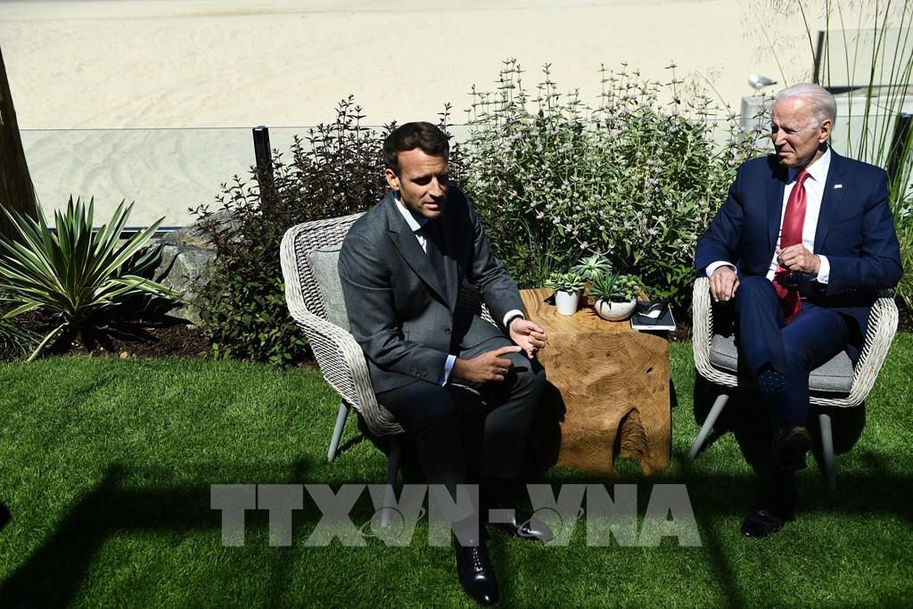 Trong cuộc điện đàm ngày 22/9/2021, Tổng thống Mỹ Joe Biden và người đồng cấp Pháp Emmanuel Macron đã nhất trí khôi phục sự tin tưởng lẫn nhau sau những căng thẳng gần đây liên quan đến việc Mỹ, Anh và Australia công bố thỏa thuận an ninh 3 bên AUKUS, dẫn đến Canberra rút khỏi thỏa thuận tàu ngầm với Paris. Trong ảnh (tư liệu): Tổng thống Mỹ Joe Biden (phải) và Tổng thống Pháp Emmanuel Macron tại cuộc gặp ở Cornwall, Anh, ngày 13/6/2021. Ảnh: AFP/TTXVN