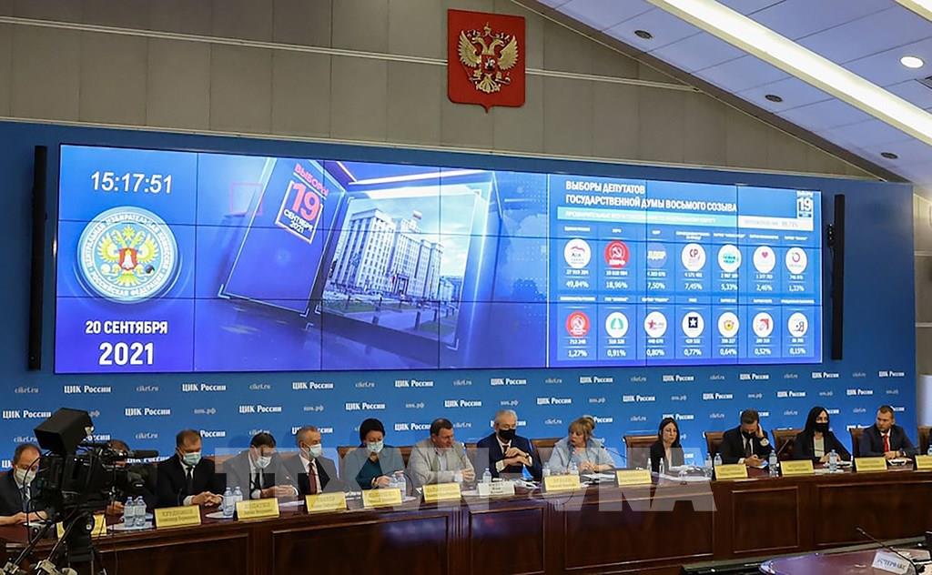Chủ tịch Ủy ban Bầu cử Trung ương Nga Ella Pamfilova (thứ 5, phải) trong cuộc họp báo công bố kết quả cuộc bầu cử Duma Quốc gia (Hạ viện) Nga, tại Moskva ngày 20/9/2021. Ảnh: EPA-EFE/TTXVN