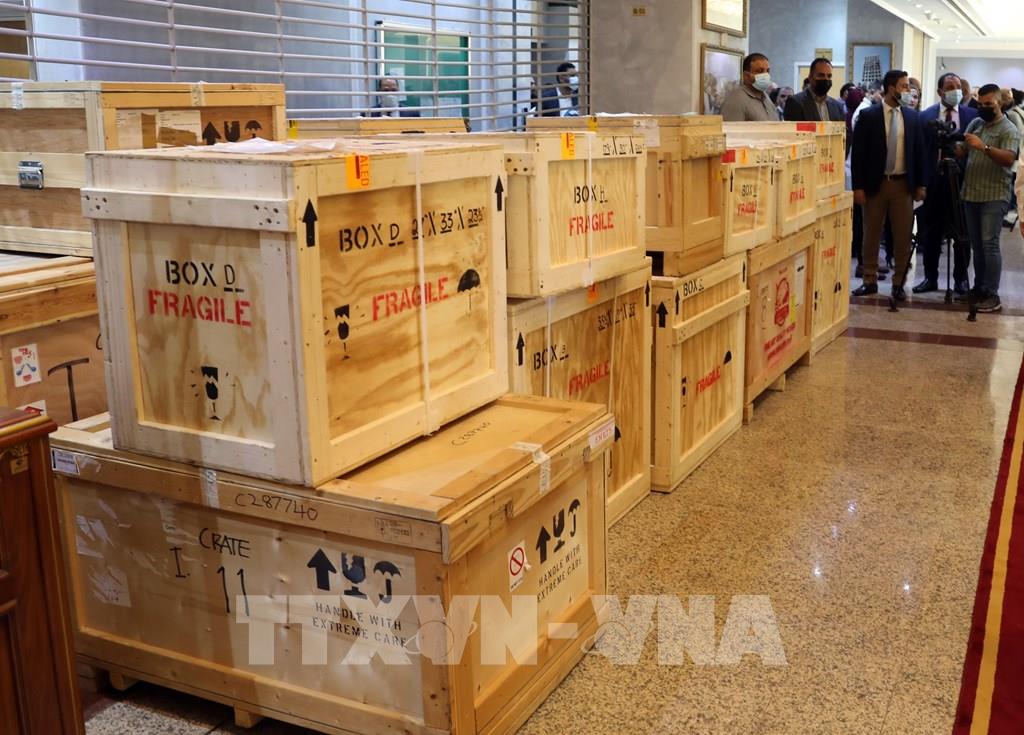 Ngày 3/8/2021, Iraq cho biết Mỹ sẽ trả lại hơn 17.000 cổ vật bị đưa ra khỏi quốc gia Trung Đông này kể từ khi Washington triển khai quân đội tại Iraq vào năm 2003. Trong ảnh: Các thùng chứa cổ vật bị chiếm giữ được Mỹ trao trả lại cho Bộ Ngoại giao Iraq tại Baghdad ngày 3/8/2021. Ảnh: THX/TTXVN