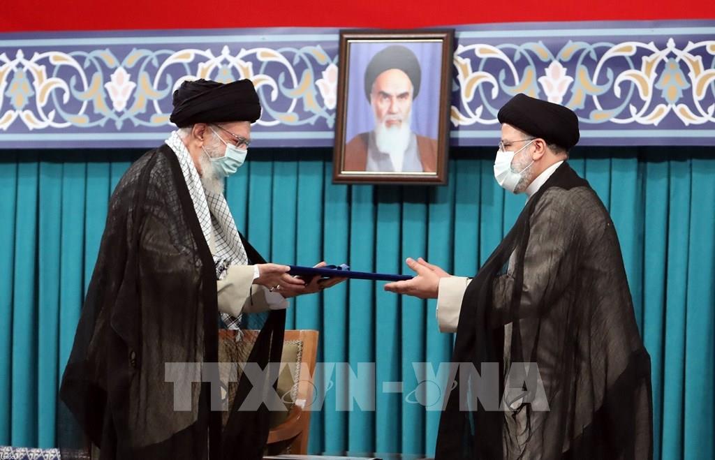 Tổng thống đắc cử Iran Ebrahim Raisi ngày 5/8/2021 chính thức tuyên thệ nhậm chức trước Quốc hội nước này. Trong ảnh: Đại giáo chủ Iran Ayatollah Ali Khamenei (trái) trao quyết định bổ nhiệm cho Tổng thống đắc cử Ebrahim Raisi tại Tehran ngày 3/8/2021. Ảnh: AFP/TTXVN