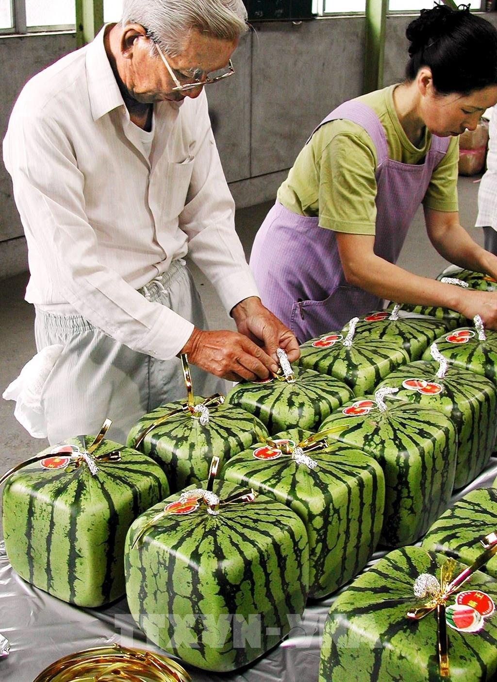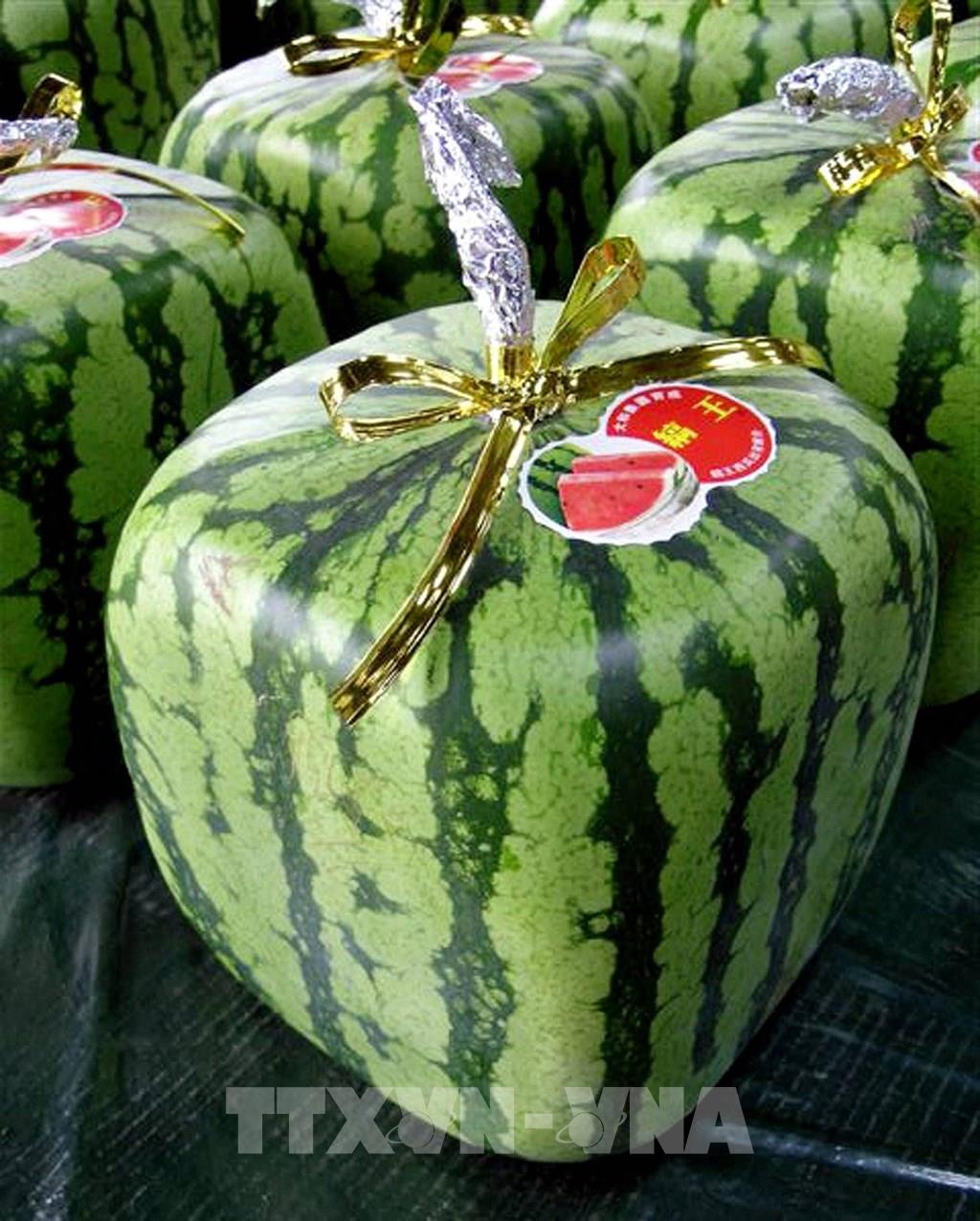 Ngày 30/6/2021, người trồng dưa hấu vuông ở thành phố Zentsuji trên đảo Shikoku, miền Tây Nhật Bản, đã bắt đầu giao cho các nhà bán buôn lô dưa hấu vuông đầu tiên của năm nay. Do mục đích để trưng bày ở những nơi như cửa hàng bách hóa và cửa hàng hoa quả, chứ không phải để ăn, nên các quả dưa vuông được hái khi còn xanh và có thể trưng bày đến 6 tháng. Giá thành mỗi quả khoảng 10.000 yên (khoảng 90 USD). Ảnh: AFP/ TTXVN