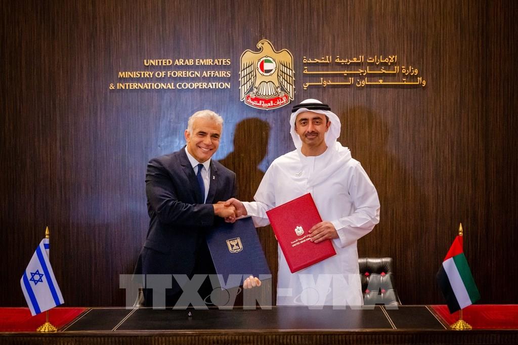 Trong khuôn khổ chuyến thăm tới Các Tiểu vương quốc Arab Thống nhất (UAE), ngày 29/6/2021, Ngoại trưởng Israel Yair Lapid (trái) và Ngoại trưởng UAE Abdullah bin Zayed Al Nahyan (phải) đã ký thỏa thuận kinh tế và thương mại giữa hai nước. Ảnh: AFP/ TTXVN