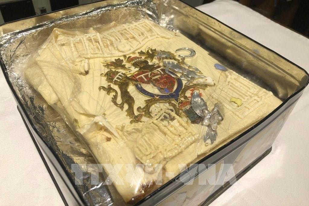 Một lát bánh ngọt trong đám cưới của Thái tử Charles và Công nương Diana Spencer (năm 1981) đã được mua lại với giá 1.850 bảng Anh (hơn 2.500 USD) trong cuộc đấu giá do nhà đấu giá Dominic Winter Auctioneers (Anh) tổ chức ngày 11/8/2021 - kèm theo lời cảnh báo "không nên ăn". Đó là một lát bánh hạnh nhân 40 năm tuổi, được phủ một lớp đường bột dày màu trắng và trang trí với Hoàng gia huy của Vương quốc Anh. Ảnh: AP/ TTXVN