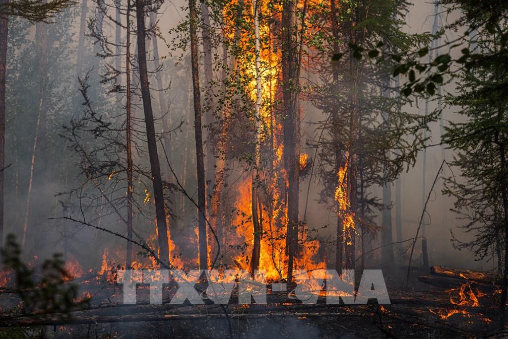 Lũ lụt, cháy rừng và nắng nóng đang đe dọa nhiều quốc gia tại châu Âu. Các chuyên gia khí tượng cho rằng biến đổi khí hậu là nguyên nhân làm gia tăng tần suất, cũng như cường độ của các hình thái thời tiết cực đoan. Trong ảnh: Đám cháy rừng tại Yakutia, Siberia, Nga, ngày 27/7/2021. Ảnh: AFP/TTXVN