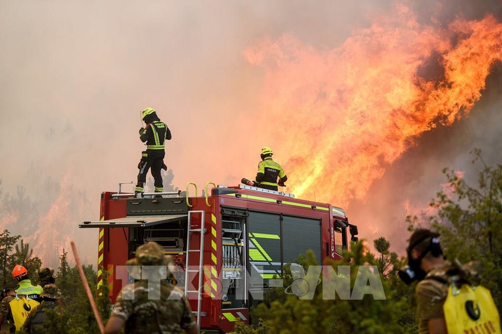 Lũ lụt, cháy rừng và nắng nóng đang đe dọa nhiều quốc gia tại châu Âu. Các chuyên gia khí tượng cho rằng biến đổi khí hậu là nguyên nhân làm gia tăng tần suất, cũng như cường độ của các hình thái thời tiết cực đoan. Trong ảnh: Lực lượng cứu hỏa nỗ lực khống chế đám cháy rừng tại Budinarci, CH Bắc Macedonia, ngày 9/8/2021. Ảnh: AFP/ TTXVN