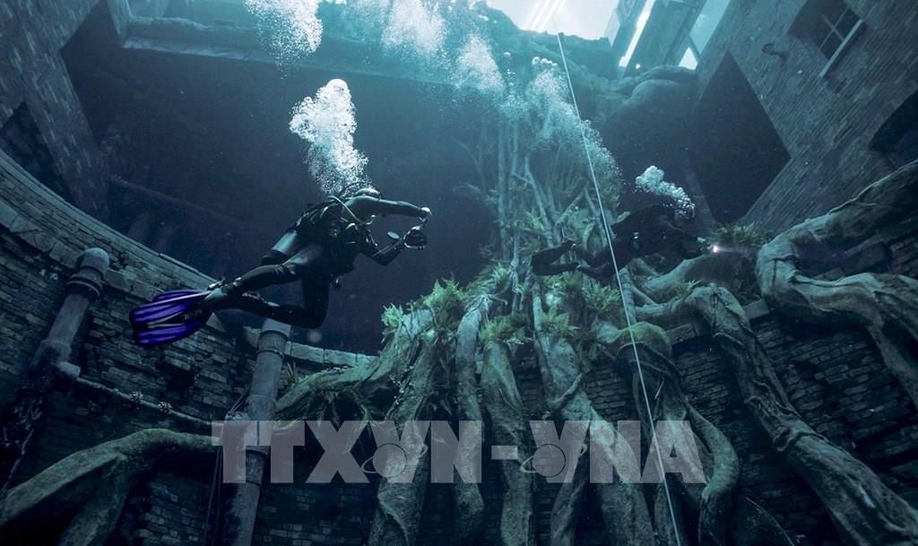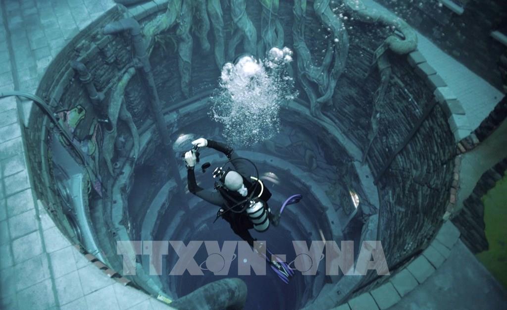 Với độ sâu tới 60 mét, bể bơi Deep Dive Dubai ở Dubai (Các Tiểu vương quốc Arab thống nhất - UAE) đã phá vỡ kỷ lục Guinness bể bơi sâu nhất thế giới của bể Deepspot, Ba Lan - nơi có độ sâu hơn 45 mét. Bể Deep Dive Dubai rộng 1.500 m2, chứa hơn 14 triệu lít nước, tương đương thể tích của 6 bể bơi tiêu chuẩn Olympic. Trong ảnh: Thợ lặn trải nghiệm bể bơi Deep Dive Dubai ở UAE ngày 10/7/2021. Ảnh: AFP/TTXVN