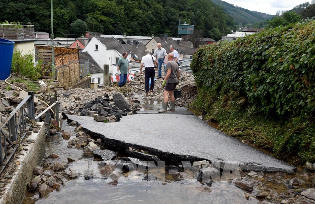 Đức và Bỉ tiếp tục ghi nhận thêm nhiều người thiệt mạng do mưa lớn và lũ lụt trong 2 ngày qua. Tại Đức, mưa, lũ lụt đã khiến ít nhất 58 người thiệt mạng và hàng chục người mất tích khi nước lũ vẫn tiếp tục dâng, khiến nhiều ngôi nhà có nguy cơ bị sập. Trong khi đó, tính đến chiều 15/7/2021, ít nhất 7 người đã thiệt mạng do lũ lụt tại các địa phương ở Bỉ. Trong ảnh: Một tuyến đường bị phá hủy do lũ lụt tại Hagen, Đức, ngày 15/7/2021. Ảnh: AFP/ TTXVN