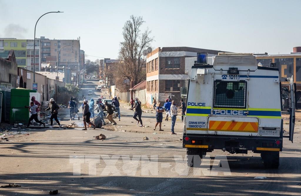 Ngày 15/7/2021, Chính phủ Nam Phi thông báo tình hình bạo loạn đang lan rộng tại quốc gia này đã cướp đi sinh mạng của 117 người. Bạo lực leo thang sau khi cựu Tổng thống Jacob Zuma tự ra trình diện cảnh sát hôm 7/7 để thi hành án tù 15 tháng với tội danh bất tuân lệnh triệu tập của tòa án. Trong ảnh: Cảnh sát được triển khai giữ trật tự tại Johannesburg, Nam Phi, ngày 11/7/2021. Ảnh: THX/TTXVNt