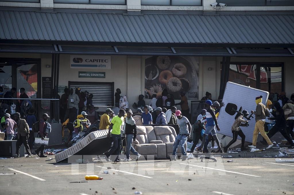 Ngày 15/7/2021, Chính phủ Nam Phi thông báo tình hình bạo loạn đang lan rộng tại quốc gia này đã cướp đi sinh mạng của 117 người. Bạo lực leo thang sau khi cựu Tổng thống Jacob Zuma tự ra trình diện cảnh sát hôm 7/7 để thi hành án tù 15 tháng với tội danh bất tuân lệnh triệu tập của tòa án. Trong ảnh: Các đối tượng cướp phá tại một cửa hàng ở Johannesburg, Nam Phi, ngày 12/7/2021. Ảnh: AFP/TTXVN