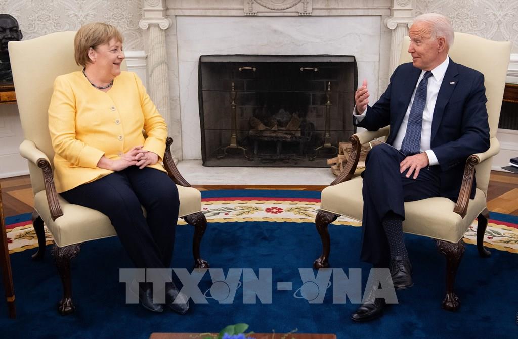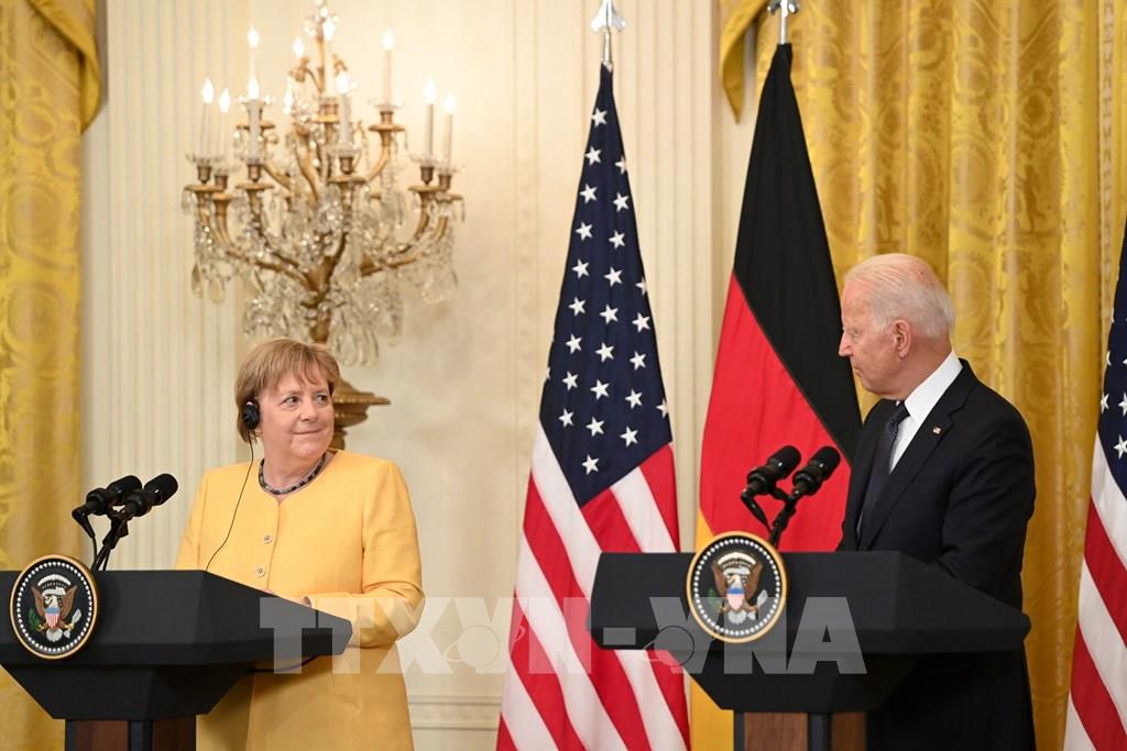 Ngày 15/7/2021, Tổng thống Mỹ Joe Biden (phải) có cuộc hội đàm với Thủ tướng Đức Angela Merkel (trái) tại Nhà Trắng. Tại cuộc gặp, Tổng thống Joe Biden khẳng định "sự hợp tác giữa Mỹ và Đức là mạnh mẽ và chúng tôi hy vọng điều này sẽ được tiếp tục". Về phần mình, Thủ tướng Merkel khẳng định "coi trọng tình hữu nghị" với Washington. Đây là chuyến thăm cuối cùng của bà Merkel tới thủ đô Washington trước khi mãn nhiệm vào cuối năm nay. Ảnh: AFP/ TTXVN