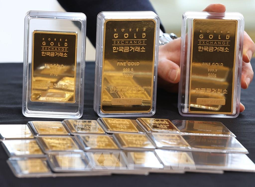 Giá vàng phục hồi từ mức thấp của một năm trong phiên 21/7/2022. Giá vàng giao ngay tăng 1% lên 1.712,61 USD/ounce, sau khi chạm mức thấp nhất kể từ tháng 3/2021 là 1.680,25 USD/ounce. Giá vàng kỳ hạn của Mỹ tăng 0,6% lên 1.711 USD/ounce. Trong ảnh: Vàng miếng được trưng bày tại Sàn giao dịch vàng ở Seoul, Hàn Quốc. Ảnh: Yonhap/ TTXVN
