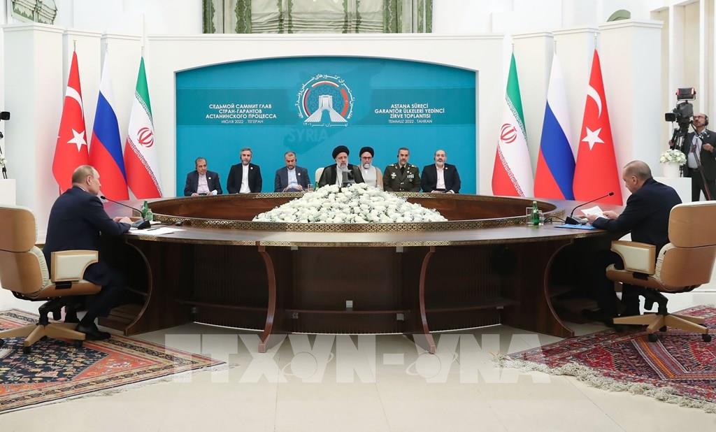 Nga, Thổ Nhĩ Kỳ và Iran ngày 19/7/2022 cam kết tiếp tục hợp tác chống khủng bố ở Syria. Theo tuyên bố chung sau cuộc họp thượng đỉnh ba bên ở Tehran, Tổng thống Iran Ebrahim Raisi (giữa) cùng Tổng thống Nga Vladimir Putin (trái) và Tổng thống Thổ Nhĩ Kỳ Recep Tayyip Erdogan (phải) "tái khẳng định quyết tâm tiếp tục sự hợp tác hiện nay nhằm mục đích loại trừ các cá nhân, tổ chức, nhóm và thực thể khủng bố", cũng như bày tỏ sự phản đối việc chiếm hữu và chuyển nguồn thu dầu mỏ thuộc về Syria một cách trái phép. Ảnh: THX/ TTXVN