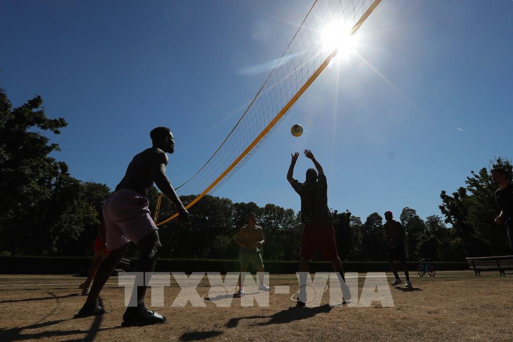 Cơ quan giám sát khí quyển của châu Âu (Copernicus) ngày 19/7/2022 cảnh báo nắng nóng tại châu lục này đang gây ô nhiễm tầng ozone nhiều đến mức gây hại cho con người, đồng thời cho biết thêm rằng các khu vực rộng lớn ở Tây Âu cũng đang phải đối mặt với nguy cơ cháy rừng rất cao. Trong ảnh: Người dân chơi thể thao dưới trời nắng nóng tại Brussels, Bỉ, ngày 19/7/2022. Ảnh: THX/ TTXVN