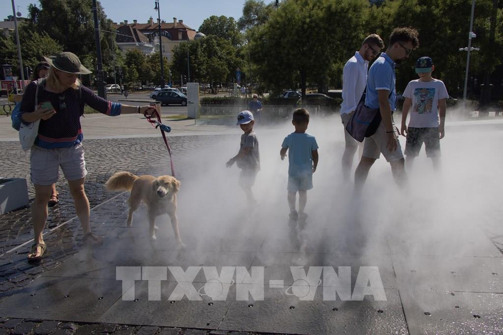 Cơ quan giám sát khí quyển của châu Âu (Copernicus) ngày 19/7/2022 cảnh báo nắng nóng tại châu lục này đang gây ô nhiễm tầng ozone nhiều đến mức gây hại cho con người, đồng thời cho biết thêm rằng các khu vực rộng lớn ở Tây Âu cũng đang phải đối mặt với nguy cơ cháy rừng rất cao. Trong ảnh: Người dân tránh nóng bên đài phun nước tại Budapest, Hungary, ngày 19/7/2022. Ảnh: THX/ TTXVN