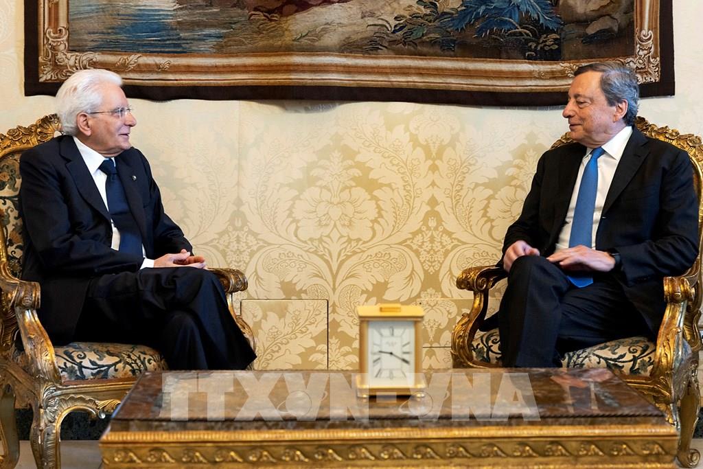 Ngày 21/7/2022, Văn phòng Tổng thống Italy cho biết Thủ tướng Mario Draghi (phải) đã đệ đơn từ chức lên Tổng thống Sergio Mattarella (trái). Một ngày trước, Thủ tướng Draghi đã giành chiến thắng trong cuộc bỏ phiếu tín nhiệm tại Thượng viện với 95 phiếu ủng hộ, 38 phiếu chống, tuy nhiên 3 đảng lớn trong liên minh cầm quyền là Phong trào 5 sao (M5S), Liên đoàn và Forza Italia đều từ chối tham gia bỏ phiếu. Ảnh: AFP/ TTXVN