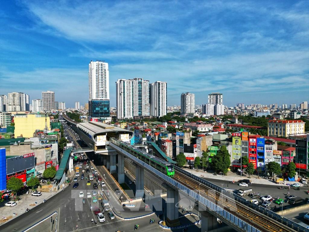 Tuyến tàu điện đường sắt trên cao Cát Linh - Hà Đông chạy trải nghiệm trong dịp lễ 2/9. Ảnh: Tuấn Anh - TTXVN