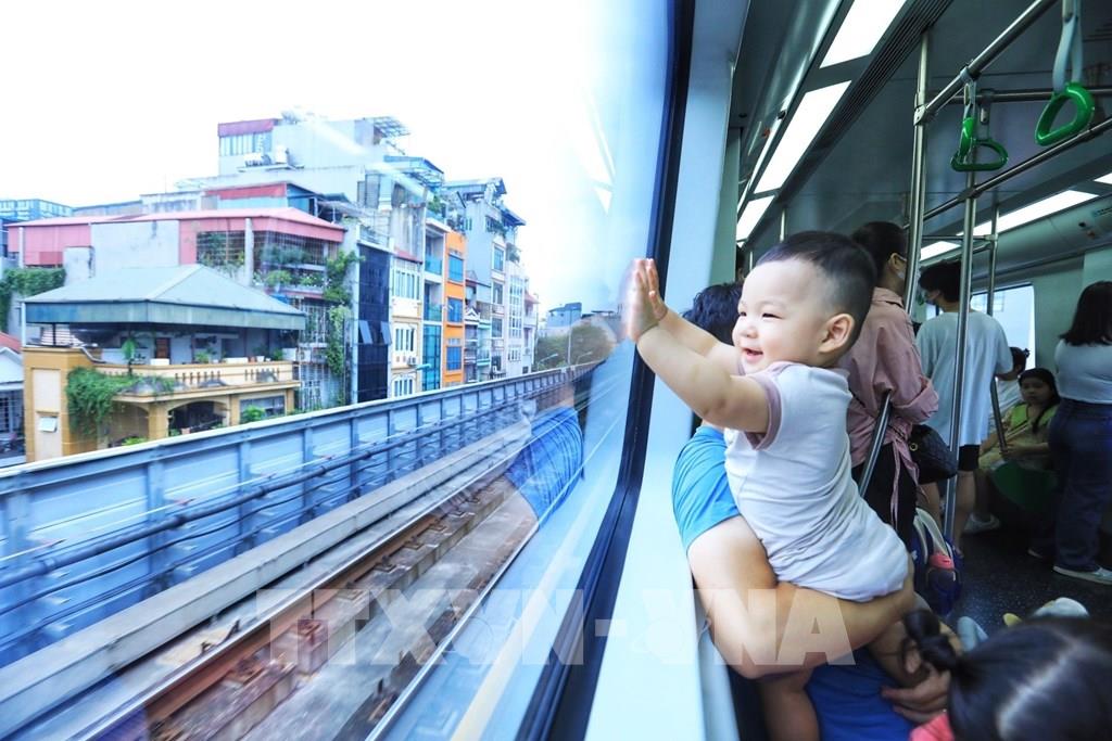 Một em bé thích thú khi được bố mẹ đưa đi chơi trên tàu điện Cát Linh – Hà Đông. Ảnh: Tuấn Anh - TTXVN