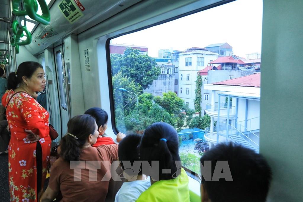 Người dân ngắm phố phường Hà Nội từ trong tàu điện. Ảnh: Tuấn Anh - TTXVN