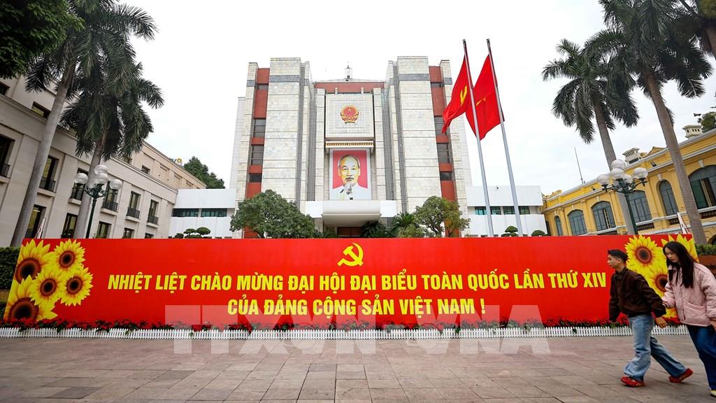 Pano chào mừng Đại hội đại biểu toàn quốc lần thứ XIV của Đảng trước trụ sở Ủy ban nhân dân thành phố Hà Nội. Ảnh: Thanh Tùng - TTXVN