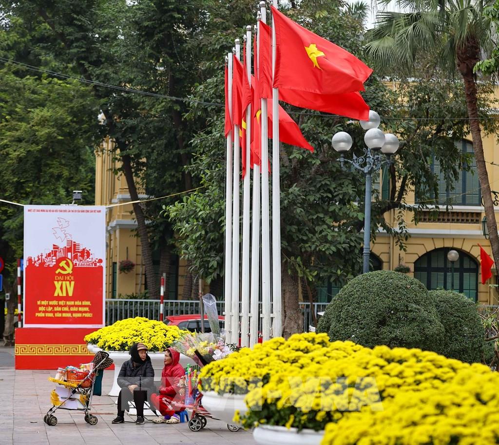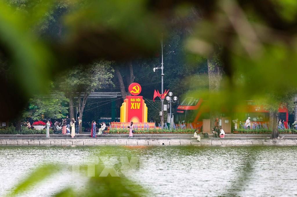 Bên Hoàn Kiếm được trang trí cờ, pano chào mừng Đại hội đại biểu toàn quốc lần thứ XIV của Đảng. Ảnh: Thanh Tùng - TTXVN