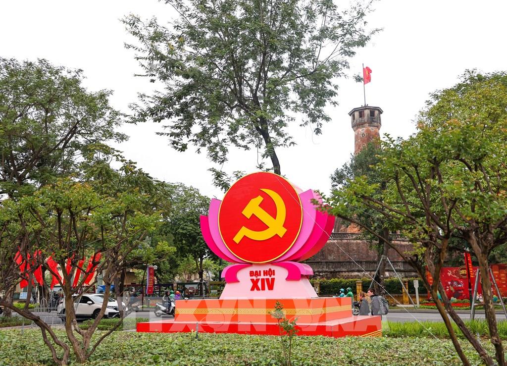 Cụm mô hình trang trí chào mừng Đại hội đại biểu toàn quốc lần thứ XIV của Đảng xuất hiện khắp mọi nẻo đường Thủ đô. Ảnh: Thanh Tùng - TTXVN